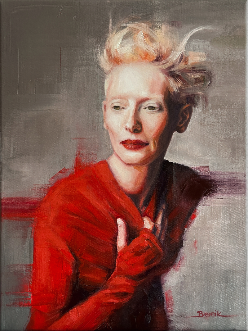 Tilda Swinton zu malen, bedeutet, sich auf das Unkonventionelle einzulassen. Ich wollte die Intensität und die leichte Arroganz (im positiven Sinne) ihres Blickes einfangen.